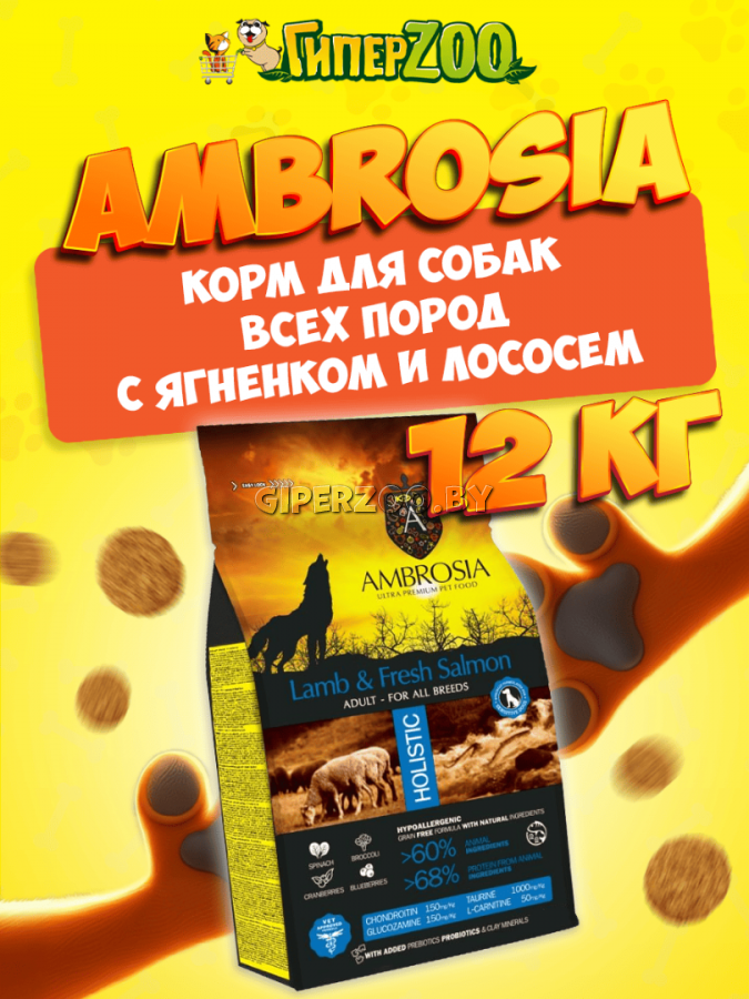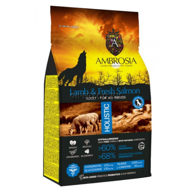 Ambrosia Adult All Breeds (Ягненок, лосось), 12 кг - это превосходный беззерновой корм, предлагающий оптимальное питание для собак всех пород.