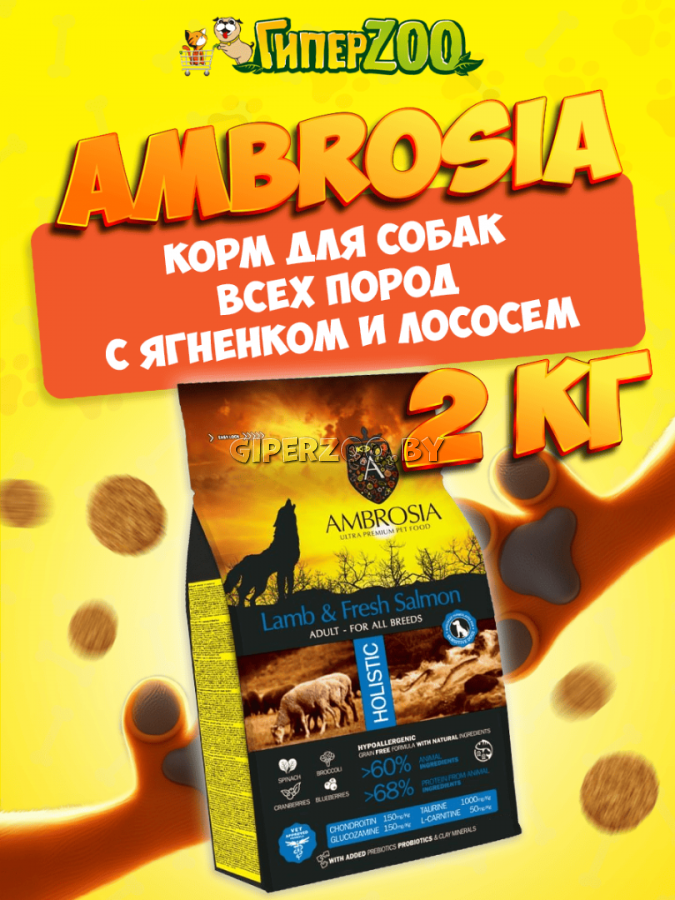 Ambrosia Adult All Breeds (Ягненок, лосось), 2 кг - это превосходный беззерновой корм, предлагающий оптимальное питание для собак всех пород.