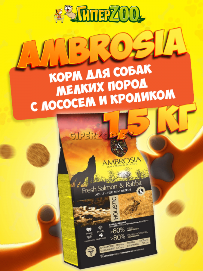 Ambrosia Adult Mini Breeds (Лосось, кролик), 1,5 кг - сухой корм сочетает в себе легко усваиваемое свежее мясо лосося и мясо кролика, богатое питательными веществами. Для усиления гипоаллергенных свойств корма в него добавлен сладкий картофель.