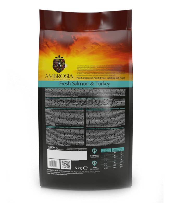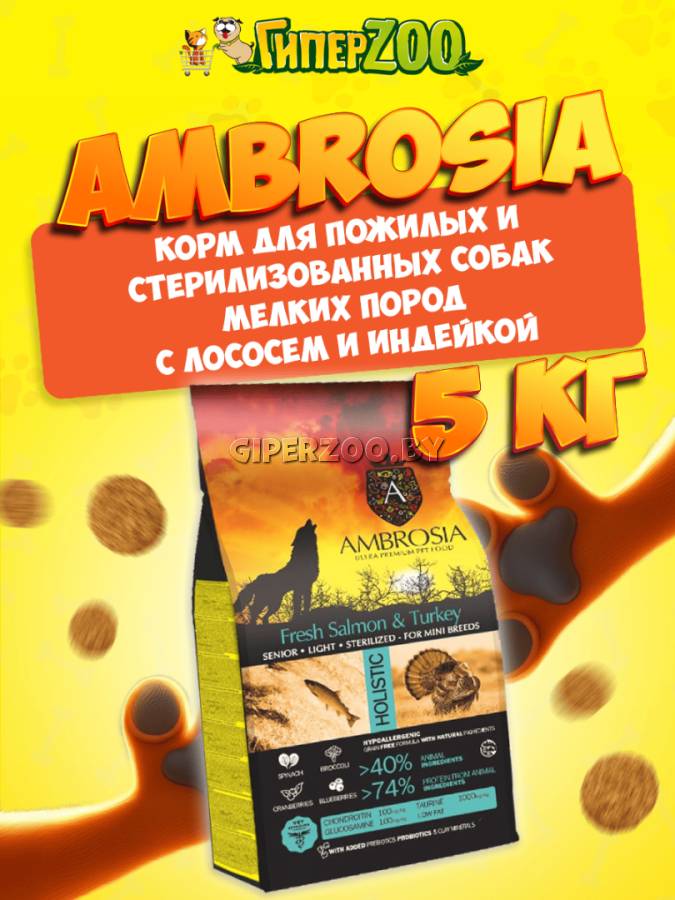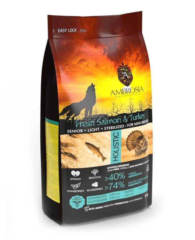 Ambrosia Senior Mini Breeds (Лосось, индейка), 5 кг - специально разработан для пожилых, страдающих ожирением и стерилизованных собак.