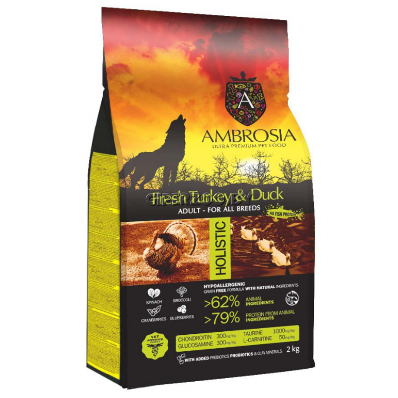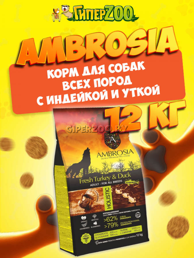 Ambrosia Adult All Breeds (Индейка, утка), 12 кг - это превосходный беззерновой корм, предлагающий оптимальное питание для собак всех пород.