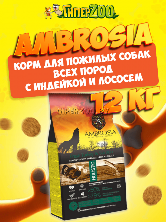 Ambrosia Senior All Breeds (Индейка, лосось), 12 кг — специально разработан для пожилых, страдающих ожирением и стерилизованных собак, содержит большое количество белка из свежего лосося и индейки с оптимизированным уровнем жиров, богатых Омега-3 и Омега-6.