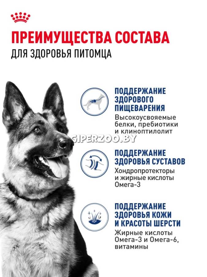 Формула продукта ROYAL CANIN® Maxi помогает поддерживать здоровое пищеварение, а также обогащена жирными кислотами омега-3 (ЭПК и ДГК) для здоровья кожи.