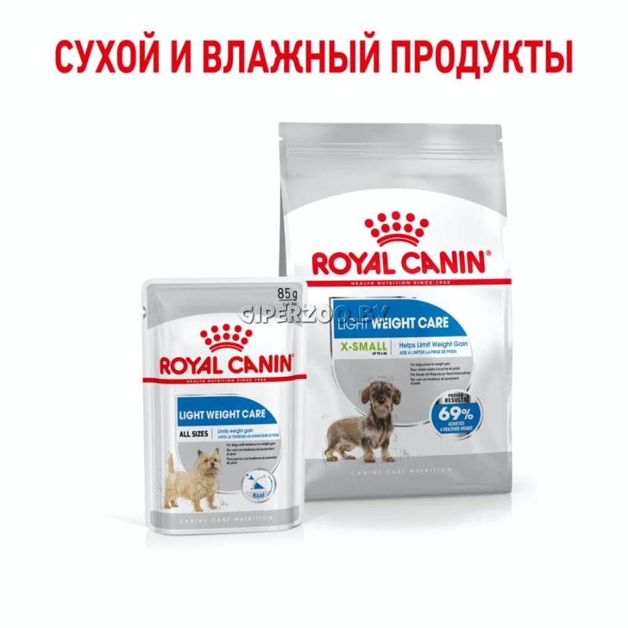 Рекомендуем сочетать паштет с аппетитными гранулами. Корм ROYAL CANIN® X-Smal Light Weight Care имеет доказанную эффективность. Согласно данным лабораторных исследований при употреблении корма ROYAL CANIN® X-Small Light Weight Care l произошло снижение веса у 69%* собак миниатюрных размеров в сравнении с обычным кормом для взрослых собак.