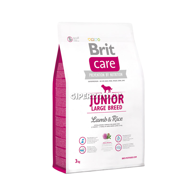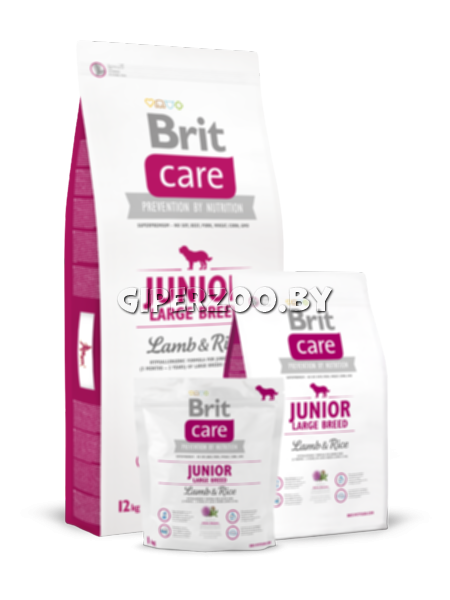 Сухой корм Brit Care Junior Large Breed Lamb & Rice (Брит для молодых собак крупных пород, Ягненок и Рис), 3 кг - это гипоаллергенный корм для молодых собак крупных пород весом от 25 кг и в возрасте от 3 месяцев до 2 лет.