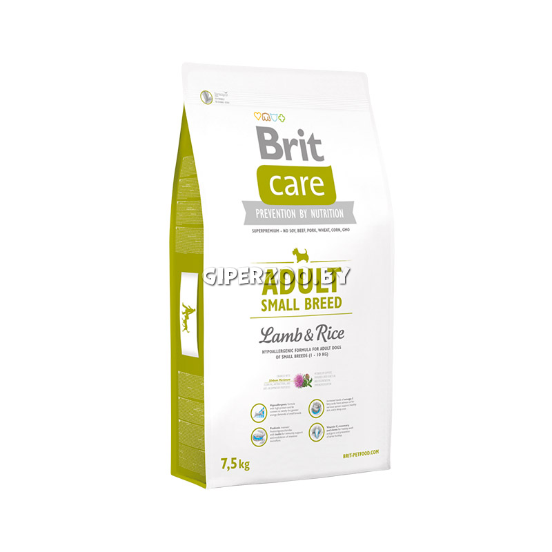 Сухой корм для собак Brit Care Adult Small Breed Lamb & Rice (Брит для собак мелких пород, ягненок и рис), 7,5 кг - это гипоаллергенный корм для собак мелких пород весом 1-10 кг.