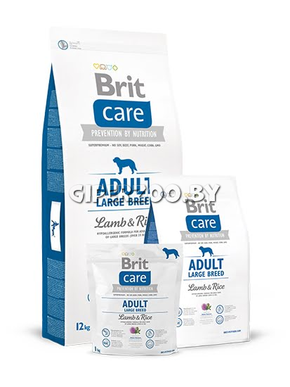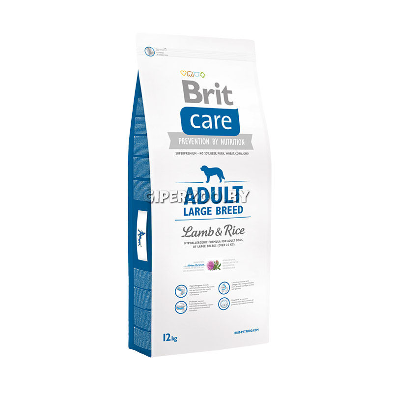 Сухой корм для собак Brit Care Adult Large Breed Lamb & Rice (Брит для взрослых собак крупных пород, ягненок и рис), 12 кг - это гипоаллергенный корм для собак крупных пород весом более 25 кг.