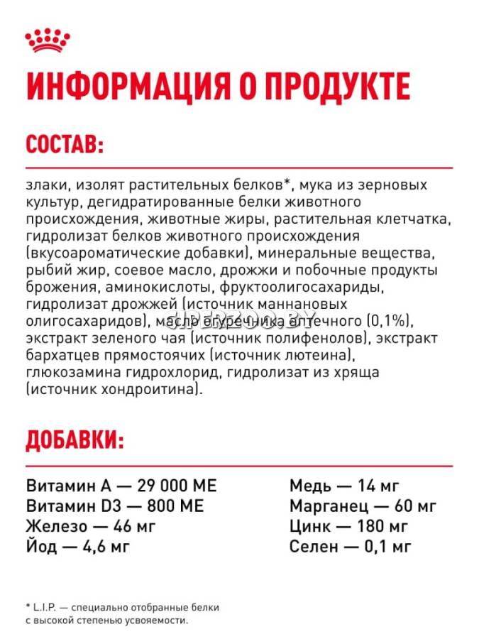 злаки, мука из зерновых культур, изолят растительных белков*, дегидратированные белки животного происхождения (птица), животные жиры, растительная клетчатка, гидролизат белков животного происхождения (вкусоароматические добавки), минеральные вещества, рыбий жир, соевое масло, дрожжи и побочные продукты брожения, фруктоолигосахариды, гидролизат дрожжей (источник мaннановых олигосахаридов), масло огуречника аптечного (0,1 %), экстракт зеленого чая (источник полифенолов), экстракт бархатцев прямостоячих (источник лютеина), глюкозамина гидрохлорид, гидролизат из хряща (источник хондроитина).