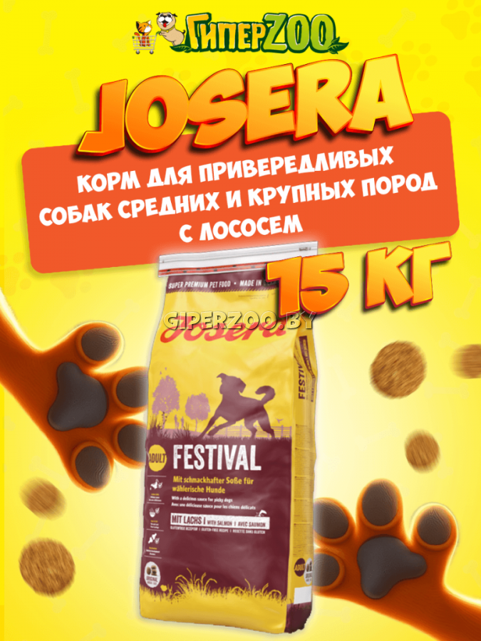 Josera Festival (лосось), 15 кг - подлинное вкусовое впечатление для вашей собаки: ведь этот корм содержит уникальную комбинацию из хрустящих гранул и изысканного порошкообразного соуса.