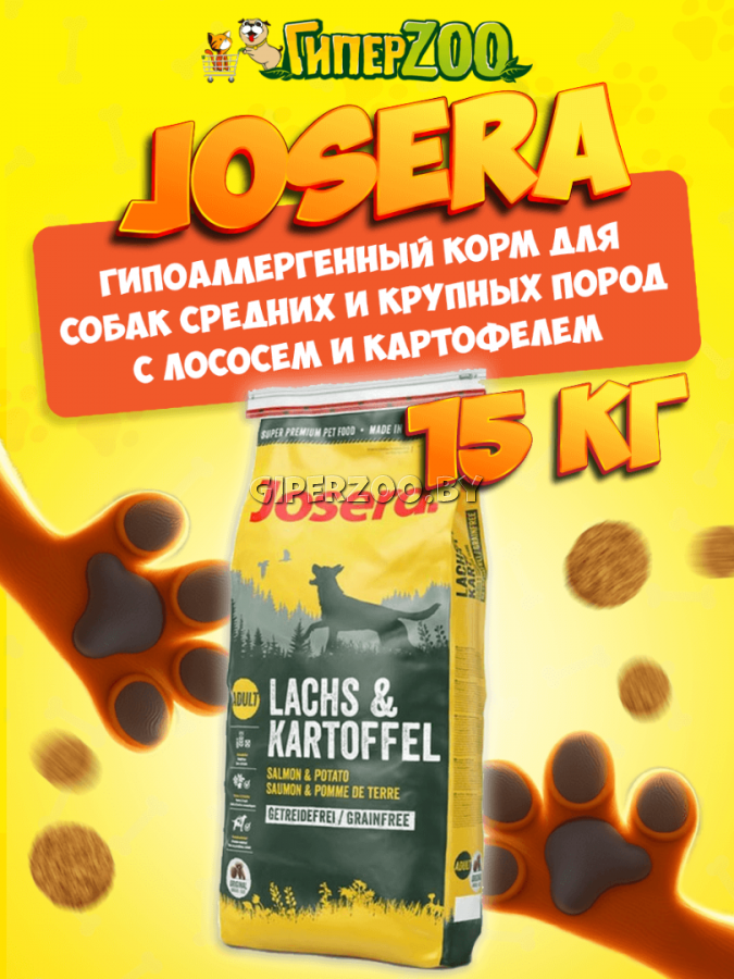 Josera Salmon & Potato (лосось), 15 кг - это сбалансированный гипоаллергенный рацион для взрослых собак. Корм не содержит зерновых, поэтому идеально подходит чувствительным питомцам.