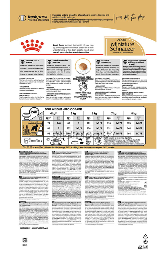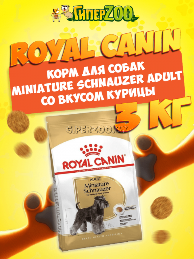 Royal Canin Miniature Schnauzer Adult, 3 кг - полнорационный сухой корм для взрослых и стареющих собак породы Миниатюрный Шнауцер в возрасте 10 месяцев и старше. Цвергшнауцер представляет собой компактную мускулистую собаку с жесткой шерстью. Это сильный дух огромного пса в маленьком теле. Он отважен и смел.