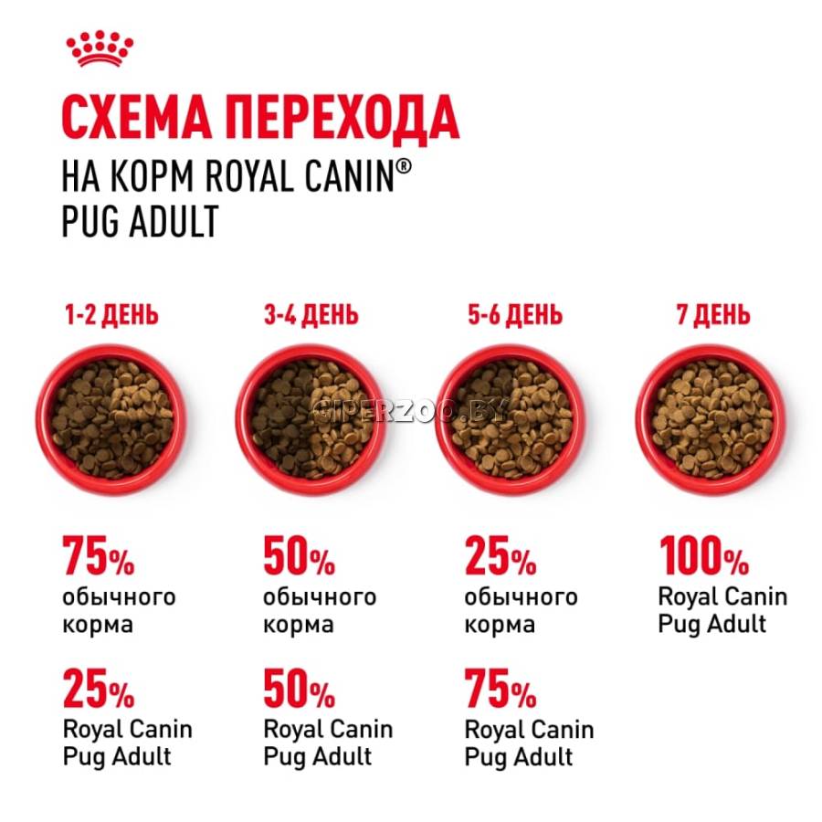 Породные особенности мопсов – брахицефальное строение челюстей и складчатая кожа. Короткие челюсти и толстые губы могут затруднить поглощение корма, кроме того, мопсы склонны заглатывать корм, не разгрызая его в достаточной степени. Гранулы Pug Adult разработаны с учетом особенностей собак породы мопс. Форма и размер гранул облегчают захват корма и способствуют тщательному разгрызанию корма перед его заглатыванием. Особые характеристики крокет обеспечивают длительное чувство насыщения и снижают риск метеоризма.