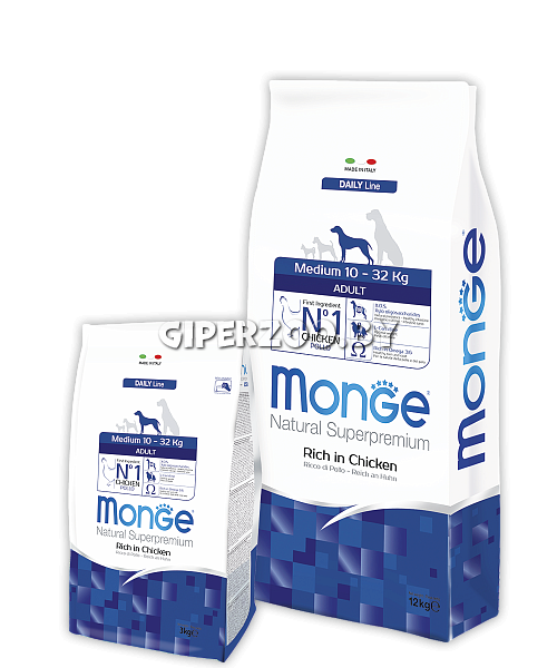 Monge Adult Medium dog (курица и рис), 15 кг - это полноценный сбалансированный рацион для взрослых собак средних пород с нормальной физической активностью. Омега-3 и омега-6 жирные кислоты для красоты шерсти и здоровья кожи. Оптимальный баланс омега-3 и омега-6 в составе корма чрезвычайно важен для поддержания кожи и шерсти в отличном состоянии.