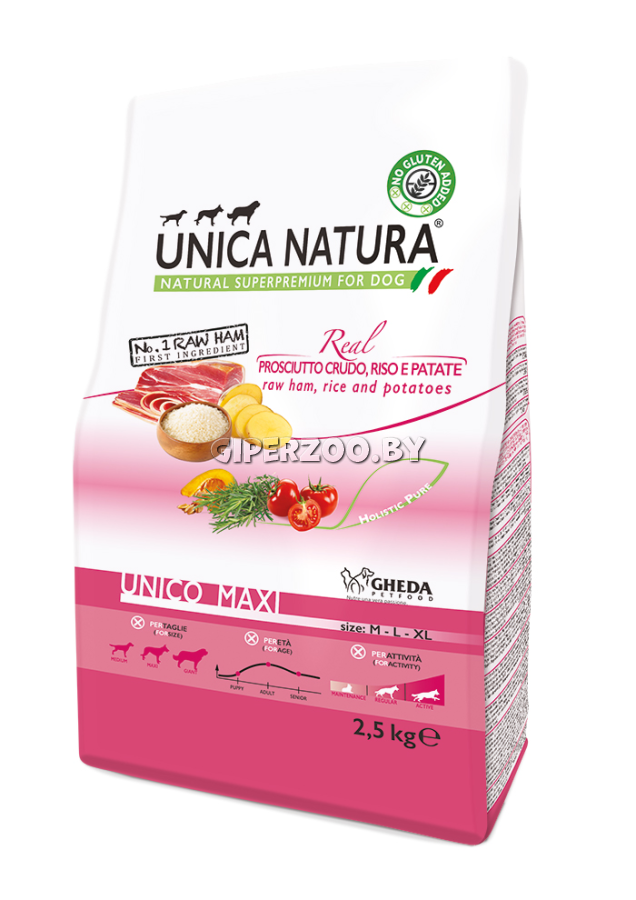 Сухой корм Unica Natura Unico Maxi для крупных пород собак (ветчина, рис, картофель), 2,5 кг - это корм для собак средних, крупных и гигантских пород всех возрастов.