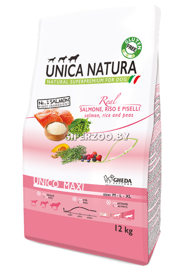 Сухой корм Unica Natura Unico Maxi для собак крупных пород (лосось, рис и горох), 12 кг - это корм для собак средних, крупных и гигантских пород всех возрастов.