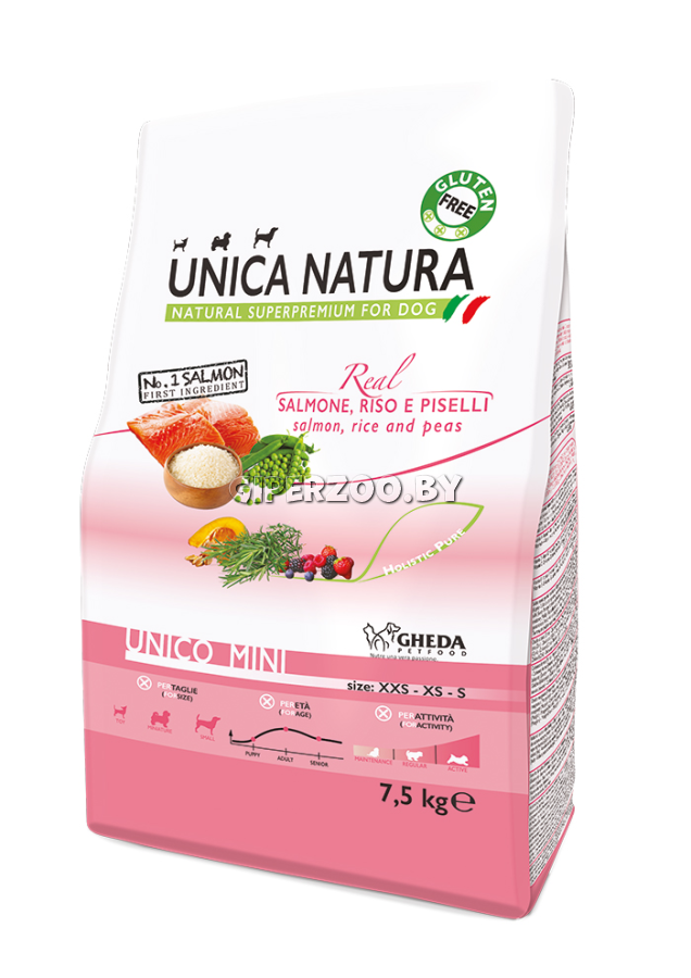 Unica Natura Unico Mini (Лосось, рис и горох), 7,5 кг - это корм для той, миниатюрных и маленьких пород собак всех возрастов.
