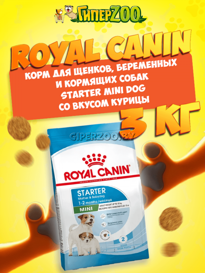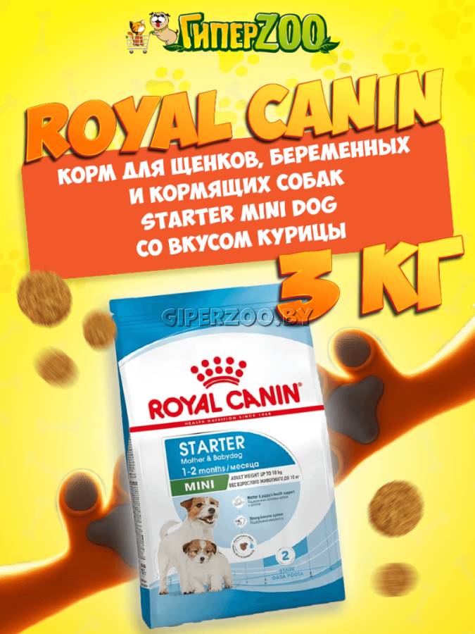 Royal Canin Starter mini, 3 кг - полнорационный сбалансированный сухой корм для сук мелких пород (вес взрослой собаки до 10кг) в конце беременности и в период лактации, а также для щенков до 2 месяцев.