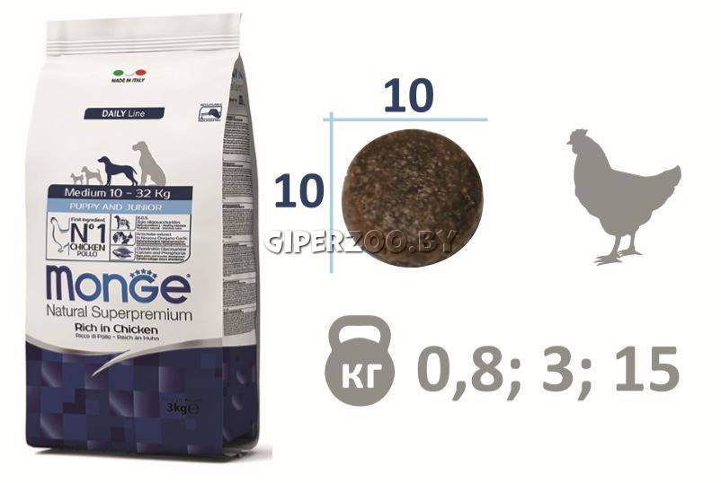 Monge Puppy&Junior Medium dog (курица и рис), 800 гр - это сбалансированный корм для щенков средних пород. Может вводиться в рацион беременных и кормящих собак. Корм отлично усваивается и способствует правильному развитию щенка.