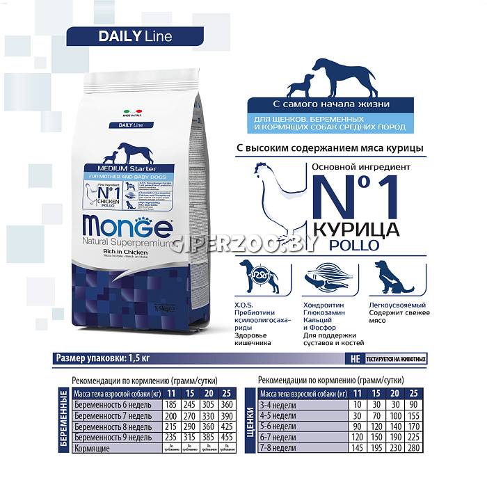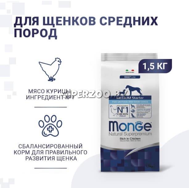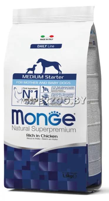 Monge Starter Medium dog (курица и рис), 1,5 кг - это полноценный сбалансированный рацион для щенков средних пород в период начала прикорма. Корм отлично усваивается и способствует правильному развитию щенка. Корм также рекомендуется во время беременности и лактации.