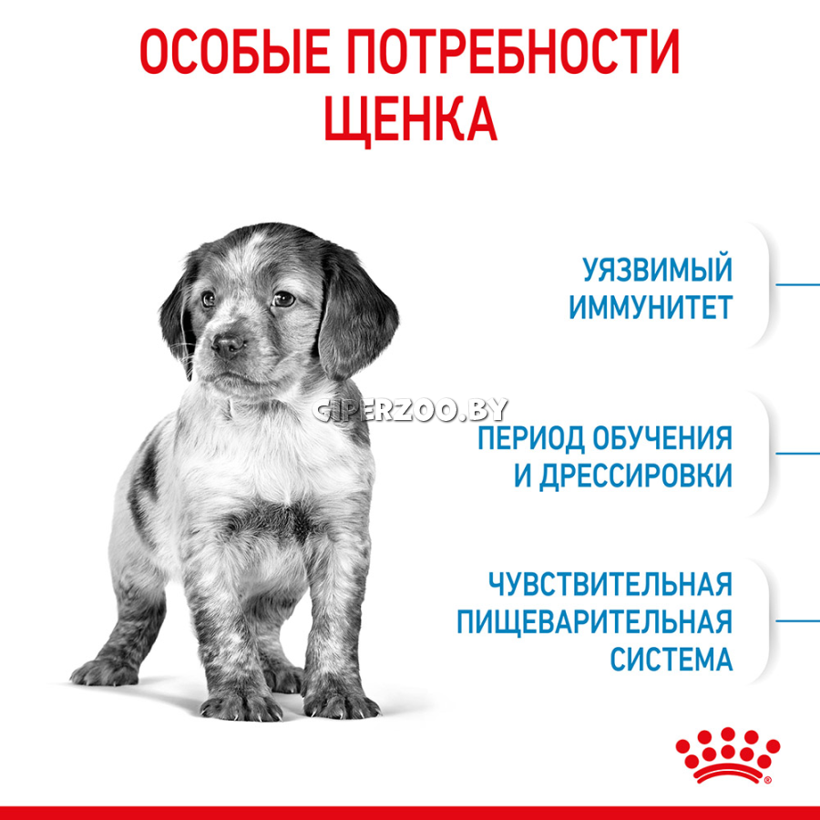 Благодаря высокому содержанию белков Royal Canin Medium Puppy поддерживает гармоничное развитие щенка, рост его костей и мышц в течение относительно короткой фазы роста.