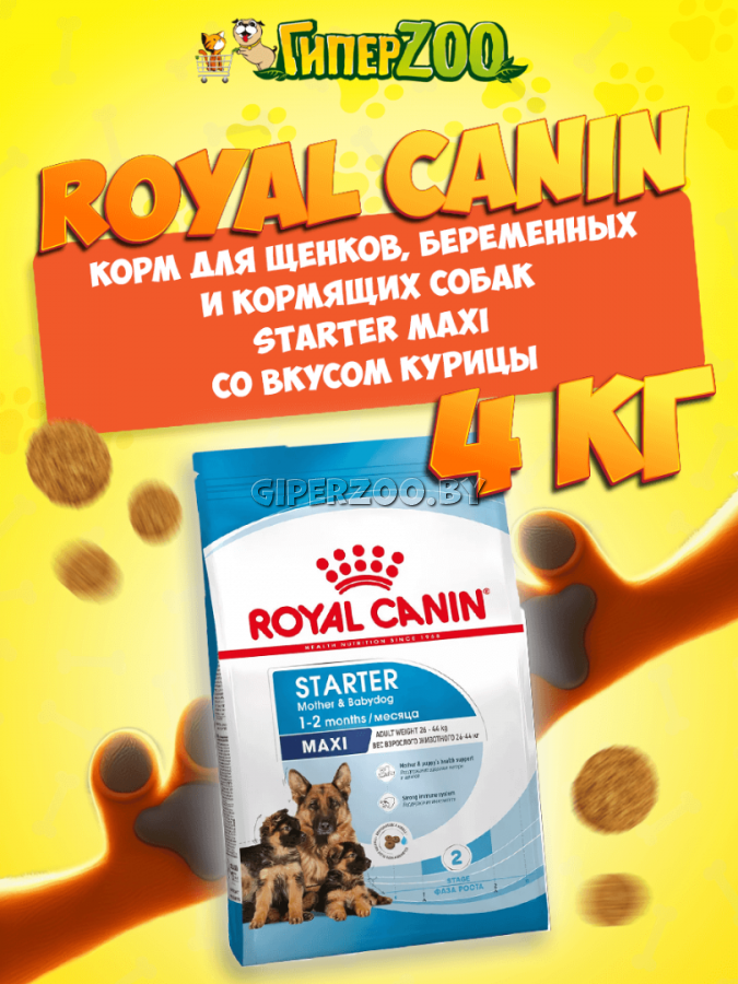Royal Canin Starter Maxi, 4 кг - корм для удовлетворения потребностей беременной или кормящей суки и ее потомства (крупными считаются собаки тех пород, взрослые представители которых весят от 26 до 44 кг).
