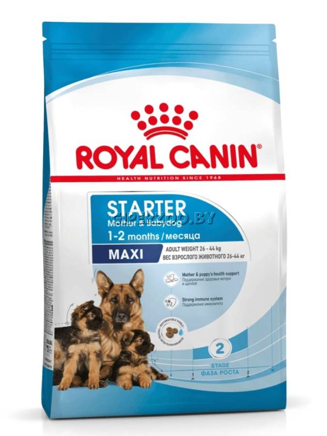 Royal Canin Starter Maxi, 15 кг - создан специально для удовлетворения потребностей беременной или кормящей суки и ее потомства (крупными считаются собаки тех пород, взрослые представители которых весят от 26 до 44 кг).