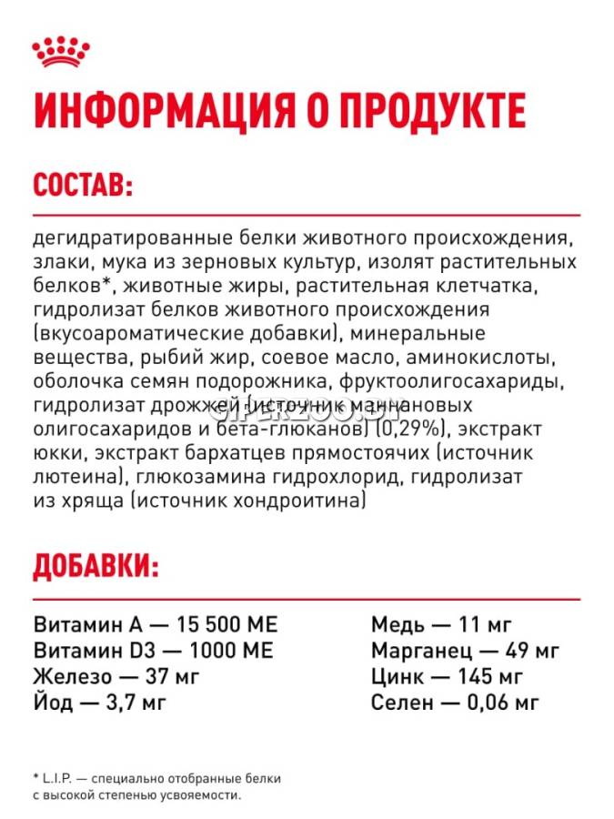 рис, дегидратированные белки животного происхождения (птица), дегидратированные белки животного происхождения (свинина)*, кукурузная мука, животные жиры, гидролизат белков животного происхождения, кукурузная клейковина, кукуруза, минеральные вещества, свекольный жом, растительная клетчатка, изолят растительных белков*, соевое масло, рыбий жир, оболочка и семена подорожника, фруктоолигосахариды, гидролизат дрожжей (источник мaннановых олигосахаридов), гидролизат из панциря ракообразных (источник глюкозамина), экстракт бархатцев прямостоячих (источник лютеина).