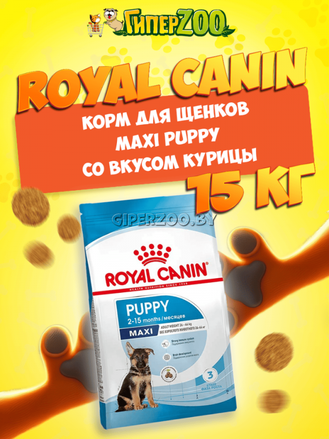 Сухой корм Royal Canin Maxi Puppy 15 кг - полнорационный сухой корм для щенков собак крупных размеров (вес взрослой собаки от 26 до 44 кг) в возрасте до 15 месяцев. Удовлетворяет умеренные энергетические потребности щенков крупных пород с продолжительным периодом роста.