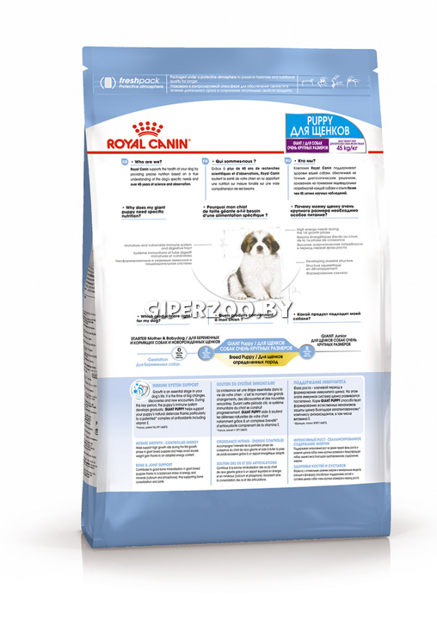 Вот почему вашему щенку необходимо адаптированное питание, которое дополнительно поддержит его развитие. В формулу продукта ROYAL CANIN® Giant Puppy включен запатентованный комплекс антиоксидантов, способствующий развитию естественных защитных механизмов щенка и сохранению его здоровья в целом. Повзрослев, Ваш щенок станет собакой очень крупных размеров. Его интенсивный рост продлится долго, и в этот период для него очень важна диетологическая поддержка. Уровень калорийности ROYAL CANIN® Giant Puppy адаптирован таким образом, чтобы обеспечить вашему щенку здоровое и гармоничное развитие.