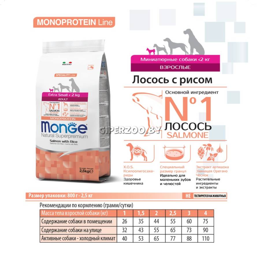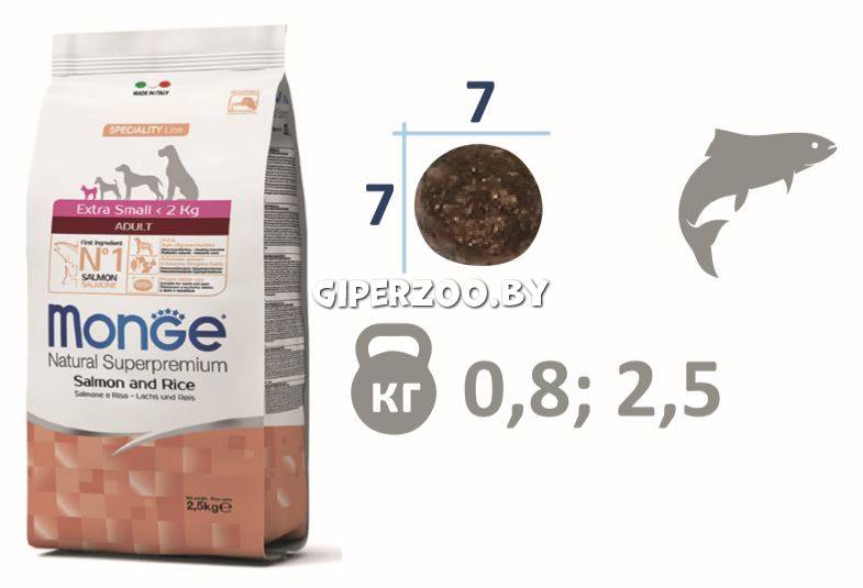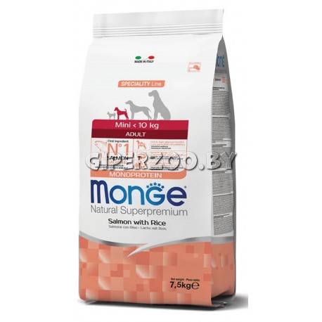 Monge Adult Mini dog (лосось и рис), 800 гр - это полноценный сбалансированный рацион для взрослых собак мелких пород с особыми потребностями. Богат омега-3 и омега-6 жирными кислотами, которые позволяют предупредить воспалительные процессы и сохранить здоровье кожи и блеск шерсти вашего питомца.