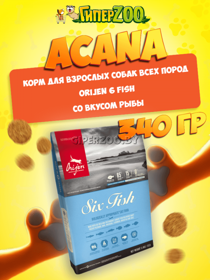 Для максимально близкого соответствия природному рациону питания собак в корме ORIJEN - 85% состава приходится на рыбные ингредиенты: корм содержит 6 видов морской рыбы, выловленной в тихоокеанских водах острова Ванкувер.