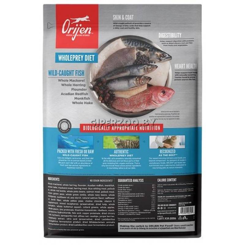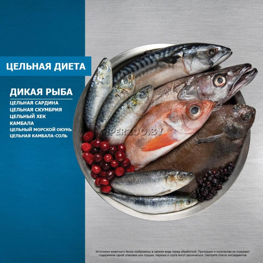 Для максимально близкого соответствия природному рациону питания собак в корме ORIJEN - 85% состава приходится на рыбные ингредиенты: корм содержит 6 видов морской рыбы, выловленной в тихоокеанских водах острова Ванкувер.