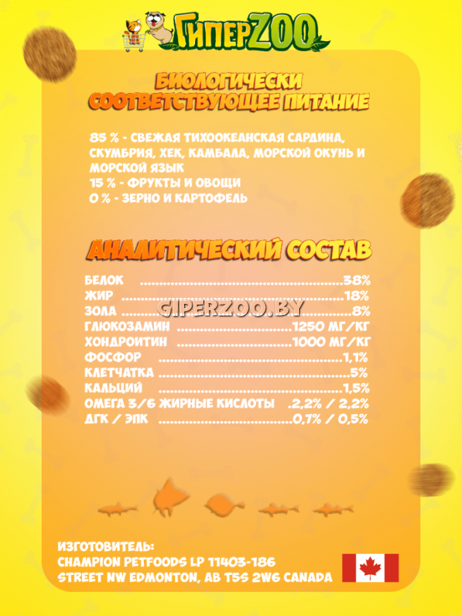 Свежая цельная тихоокеанская сардина (18%), свежая цельная тихоокеанская скумбрия (13%), свежий цельный тихоокеанский хек (12%), свежая цельная тихоокеанская камбала (5%), свежий цельный окунь (5%), свежий цельный морской язык (5%), цельная скумбрия (дегидратированная, 5%), цельная сельдь (дегидратированная, 5%), цельная треска (дегидратированная, 4,5%), цельная сардина (дегидратированная, 4,5%), цельная путассу (дегидратированная, 4%), жир сельди (4%), красная чечевица, зелёная чечевица, зелёный горошек, клетчатка из чечевицы, нут, жёлтый горошек, подсолнечное масло холодного отжима, цельная фасоль, печень трески (сублимированная), свежая столовая тыква, свежая мускатная тыква, свежий цукини, свежий пастернак, свежая морковь, свежие яблоки, свежие груши, свежая листовая капуста, свежий шпинат, свежие листья свёклы, свежая зелень репы, бурая водоросль, цельная клюква, цельная черника, цельные ягоды ирги ольхолистной, корень цикория, куркума, расторопша, корень лопуха большого, цветы лаванды, корень алтея, плоды шиповника.