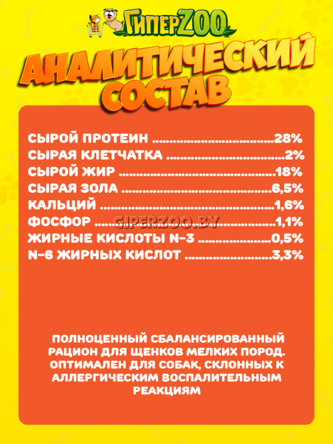 Гарантированный анализ: сырой протеин: 28%, сырая клетчатка: 2%, сырой жир: 18%, сырая зола: 6,5%, кальций: 1,6%, фосфор: 1,1%, кальций / фосфор = 1,4, жирные кислоты n-3: 0,5%, n -6 жирных кислот: 3,3%.