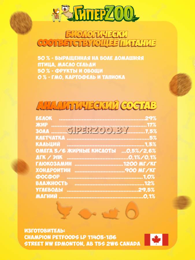 Дегидратированное мясо цыплёнка (25%), резаный овёс (23%), свежее мясо цыплёнка без костей (5%), свежие куриные внутренности (печень, сердце, почки) — 5%, красная чечевица, цельный зелёный горошек, зелёная чечевица, свежее мясо индейки без костей (4%), свежие цельные яйца (4%), куриный жир (4%), цельный нут, цельный жёлтый горошек, цельный овёс, масло сельди (3%), вяленная на солнце люцерна, клетчатка из чечевицы, бурая водоросль, свежая столовая тыква, свежая мускатная тыква, свежий пастернак, свежая листовая капуста, свежий шпинат, свежая цельная морковь, свежие яблоки сорта «Ред Делишес», свежая груша сорта «Бартлетт», сублимированная куриная печень (0,1%), соль, свежая клюква, свежая черника, корень цикория, куркума, расторопша, корень лопуха большого, цветы лаванды, корень алтея, плоды шиповника.
