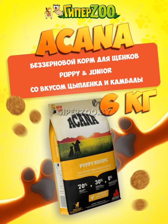 Сухой корм Acana Puppy & Junior (Акана Паппи энд Джуниор с цыпленком и камбалой), 6 кг - беззерновой корм для щенков пород, вес которых во взрослом возрасте составляет от 9 до 25 килограмм.