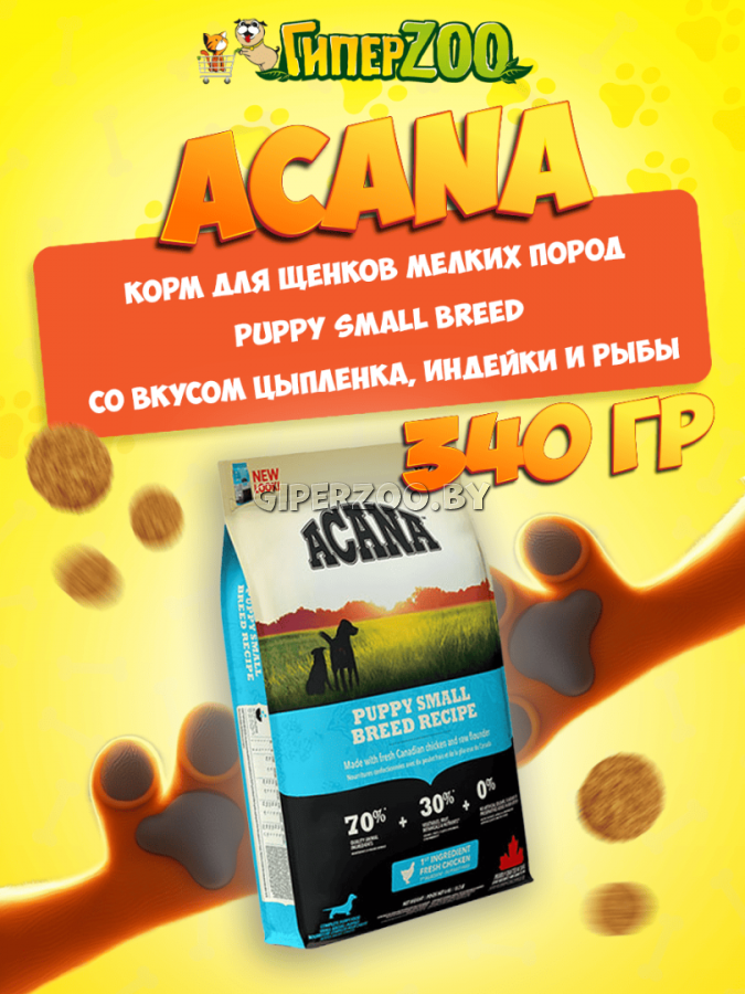 Для щенков малых пород, вес которых во взрослом возрасте не превышает 9 килограмм. Корм Acana Puppy Small Breed на 70% состоит из мяса выращенного на свободном выгуле цыпленка, яиц несущихся в гнездах кур и выловленной на воле камбалы.
