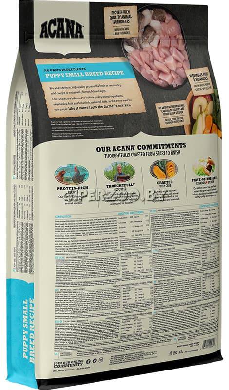 Корм ACANA не содержит зерна и быстрых углеводов, таких как рис, тапиока или картофель, а богат животными белками, которые обеспечивают здоровое развитие и отличную форму вашего щенка.