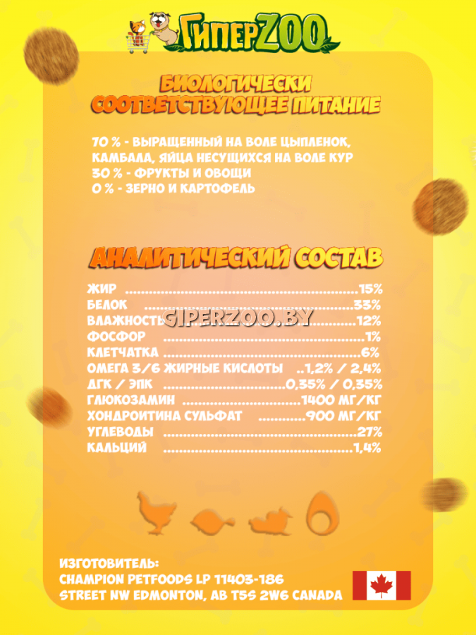 Свежее мясо цыпленка без костей (16%), дегидрированное мясо цыпленка (15%), дегидрированное мясо индейки(14%), красная чечевица, зелёный горошек, свежие куриные внутренности (печень, сердце, почки) — 6%, дегидрированное мясо атлантической сельди (4 %), свежие цельные яйца (4%), свежая цельная камбала (4%), масло сельди (3%), вяленая на солнце люцерна (2%), стручковая фасоль (2%), зеленая чечевица, желтый горошек, клетчатка из гороха, куриный жир (2%), свежие куриные хрящи (2%), бурые водоросли, свежая тыква, свежая мускатная тыква, свежий пастернак, свежая листовая капуста, свежий шпинат, свежие листья горчицы, свежая зелень репы, свежая морковь, свежие яблоки сорта «РедДелишес», свежая груша сорта «Бартлетт», сублимированная куриная печень, сублимированная печень индейки, свежая цельная клюква, свежая цельная черника, корень цикория , куркума, расторопша, корень лопуха большого, цветы лаванды, корень алтея, плоды шиповника, Enterococcus faecium NCIMB10415:600x10'6 CFU.