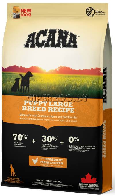 Acana Puppy Large Breed (Акана Паппи Ладж Брид) из линейки Heritage - биологически соответствующий сухой корм для щенков собак крупных и гигантских пород (вес взрослой собаки более 25 кг). Рацион подходит для беременных и кормящих. Размер гранулы 1,4 - 1,6 см.