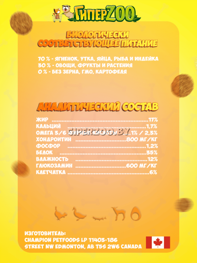 Он не содержит зерновых культур и соответствует биологическому рациону питания собак в природе. Для взрослых собак любых пород и возрастов.