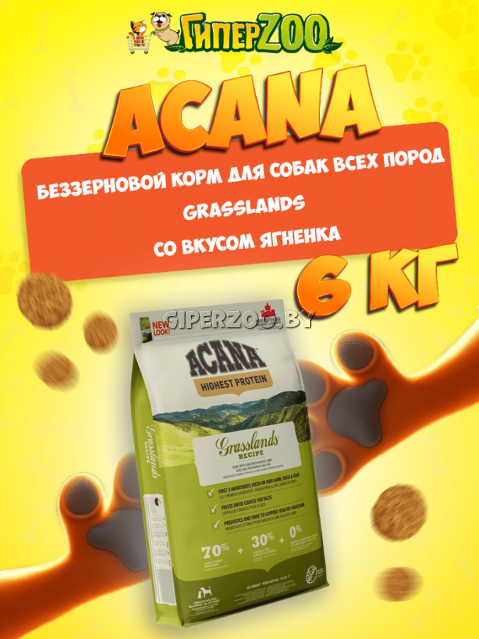 Сухой корм Acana Grasslands Dog (Ягненок) (Акана Грасслэндс Дог с ягненокм), 6 кг - беззерновой корм для собак всех пород и возрастов.