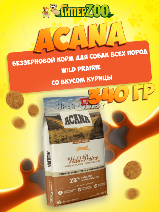 Сухой корм для собак Acana Wild Prairie Dog (Акана Вайлд Прерия Дог), 0,34 кг - беззерновой корм для собак всех пород и возрастов с курицей.