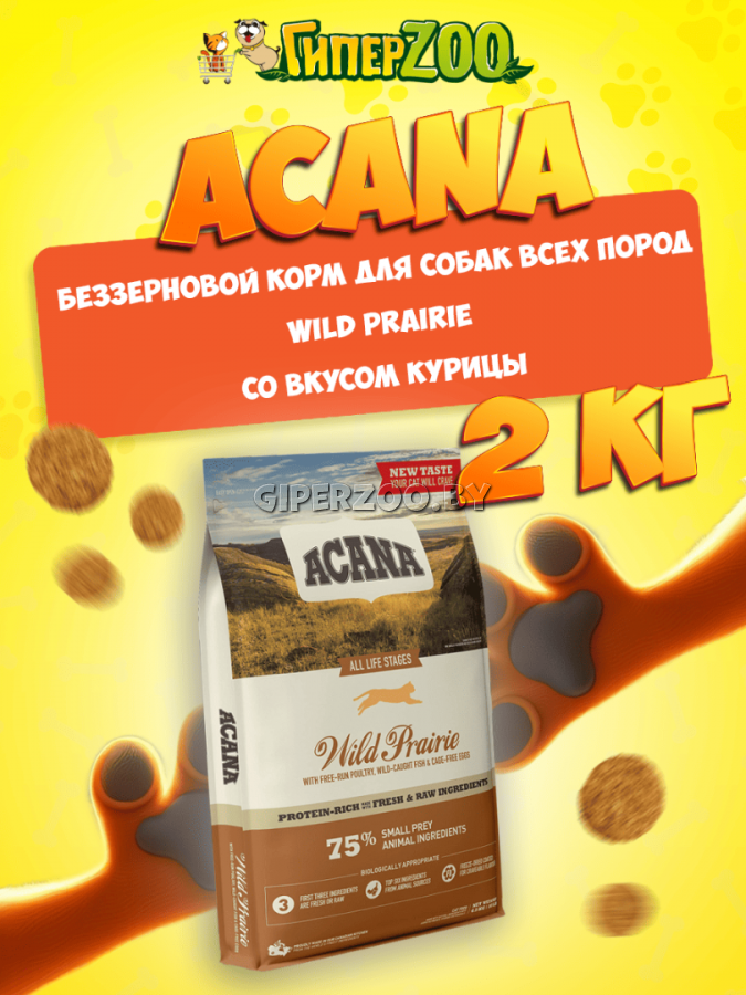 Сухой корм для собак Acana Wild Prairie Dog (Акана Вайлд Прерия Дог), 2 кг - беззерновой корм для собак всех пород и возрастов с курицей.