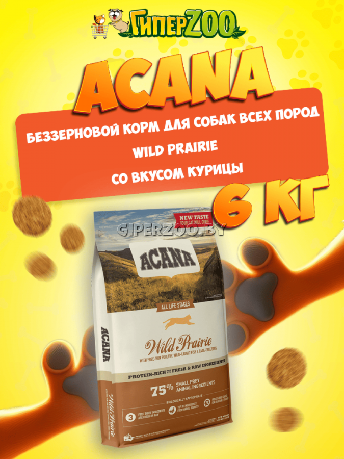 Сухой корм для собак Acana Wild Prairie Dog (Акана Вайлд Прерия Дог), 6 кг - беззерновой корм для собак всех пород и возрастов с курицей.