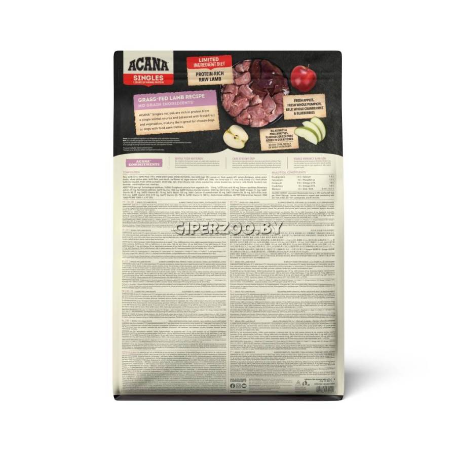 Сырая баранина (21%), мука из баранины (19%), цельный зеленый горошек, цельная красная чечевица, сырая печень ягненка (8%), рапсовое масло, свежие яблоки (4%), нут цельный, цельная зеленая чечевица, цельный желтый горошек , клетчатка чечевицы, гороховый крахмал, подсолнечное масло, водоросли (источник ЭПК и ДГК), сырой рубец ягненка (1%), сырые почки ягненка (1%), свежая цельная мускатная тыква, тыква свежая цельная, ламинария сушеная, соль, корень цикория сушеный, клюква цельная, черника цельная, куркума, расторопша пятнистая, корень лопуха, лаванда, корень алтея, плоды шиповника.