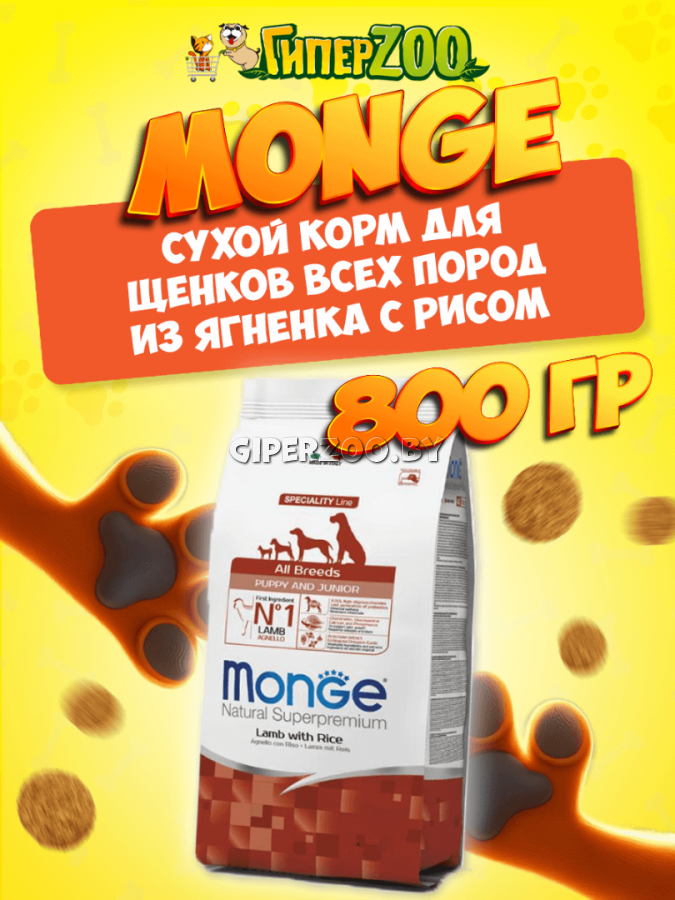 Monge Puppy&Junior All Breeds dog (ягненок и рис), 800 гр - сухой корм из мяса ягнёнка и риса для щенков всех пород.