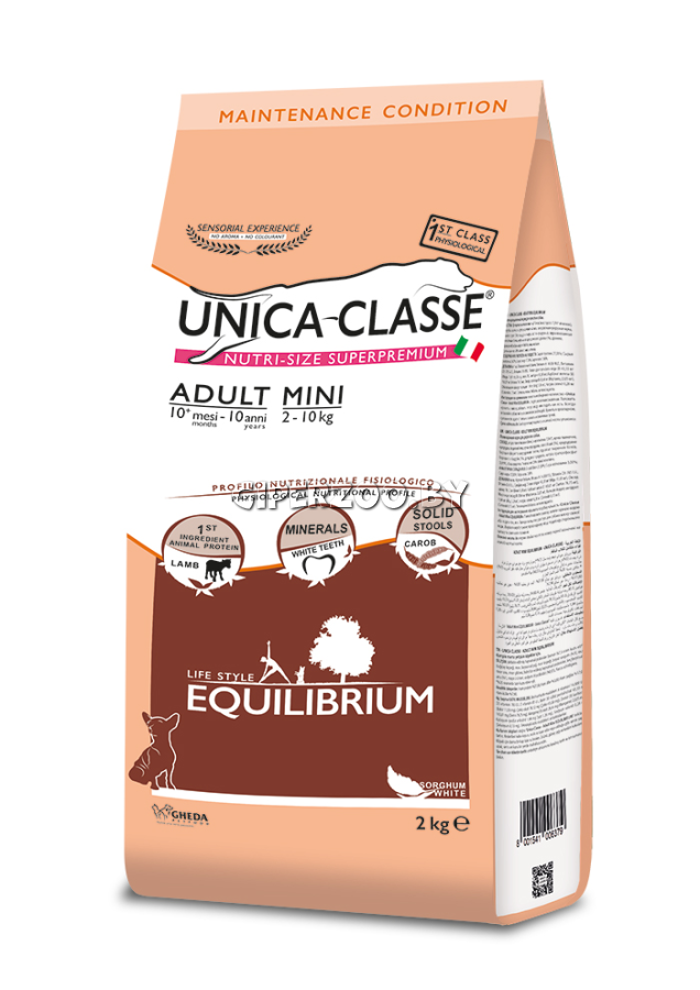 Unica Classe Adult Mini Equilibrium (ягненок), 2 кг - это полнорационный сухой корм для взрослых собак малых пород для поддержания баланса в ЖКТ.