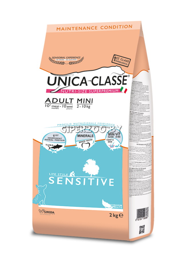 Сухой корм Unica Classe Adult Mini Sensitive для собак мелких пород (тунец) , 2 кг - это полнорационный сухой корм для взрослых собак мелких пород для поддержания красоты шерсти и здоровья кожи.