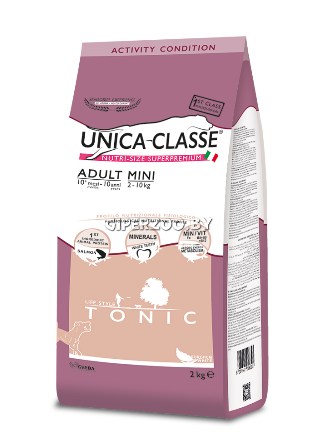 Сухой корм Unica Classe Adult Mini Tonic для собак мелких пород (лосось), 2 кг - это полнорационный сухой корм для активных собак малых пород с массой тела взрослой особи 2-10 кг.